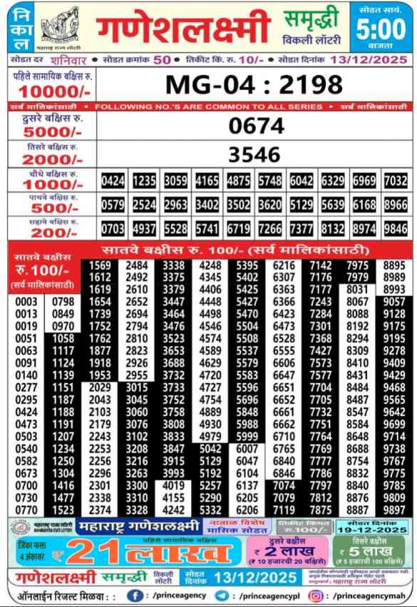 Maharashtra State Ganeshlaxmi Samriddhi Weekly Lottery ticket is only Maharashtra Weekly rupees 10 for 1 ticket, but 10 thousand is given as prize for winning the major. Results are also placed on this page which you can see Ganeshlaxmi Samriddhi Weekly Lottery Result today 13.12.2025 is searched by different names, Maharashtra State Ganeshlaxmi Samriddhi Weekly Lottery Result 05:00pm, Maharashtra State lottery 05:00pm result , Maharashtra State Lottery today Ganeshlaxmi Samriddhi Weekly lottery result, Maharashtra Ganeshlaxmi Samriddhi Lottery Result, Maharashtra State Ganeshlaxmi Samriddhi Weekly lottery result 2025, Ganeshlaxmi Samriddhi Weekly lottery result 05:00pm, Maharashtra State lottery 2025.