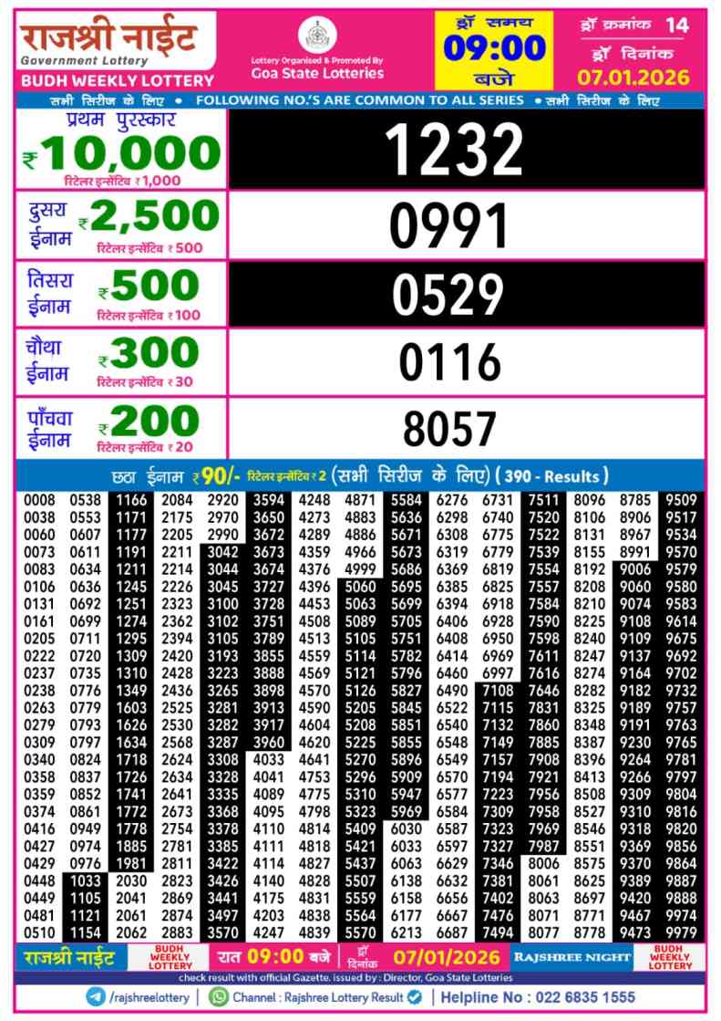 Goa Rajshree Night Budh Weekly Lottery Result 7.1.2026 Today Latest Update on 07 January 2026 : -Goa Rajshree Lottery’s Rajshree Night Budh Weekly Lottery Results have been declared to on 7.1.2026 Goa Rajshree Night Budh Weekly Lottery Result 9:00PM.