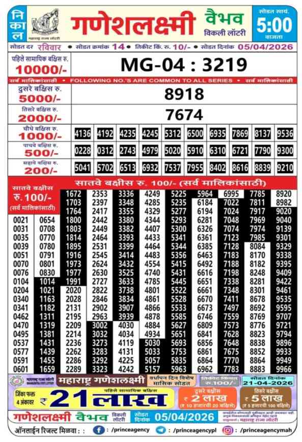 Maharashtra State Ganeshlaxmi Vaibhav Weekly Lottery ticket is only Maharashtra Weekly rupees 10 for 1 ticket, but 10 thousand is given as prize for winning the major. Results are also placed on this page which you can see Ganeshlaxmi Vaibhav Weekly Lottery Result today 5.4.2026 is searched by different names, Maharashtra State Ganeshlaxmi Vaibhav Weekly Lottery Result 05:00pm, Maharashtra State lottery 05:00pm result , Maharashtra State Lottery today Ganeshlaxmi Vaibhav Weekly lottery result, Maharashtra Ganeshlaxmi Vaibhav Lottery Result, Maharashtra State Ganeshlaxmi Vaibhav Weekly lottery result 2026, Ganeshlaxmi Vaibhav Weekly lottery result 05:00pm, Maharashtra State lottery 2026.