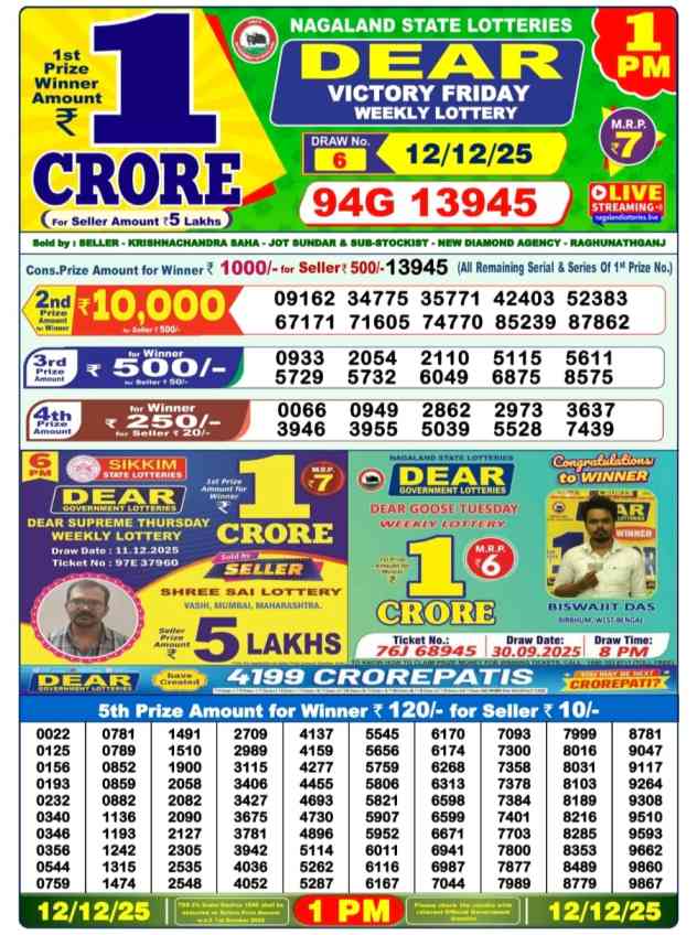 Lottery sambad 6pm is the main lottery of Kolkata(West Bengal).Since other games of lottery betting are played in Kolkata but they are illegal.Therefore West Bengal State Lottery 6pm is played more openly.West Bengal Lottery Sambad 6pm result , Sikkim State Lottery 6pm result, Dhankesari Lottery Sambad 6pm result 12.12.2025, Nagaland State Lottery Today Result 6pm.