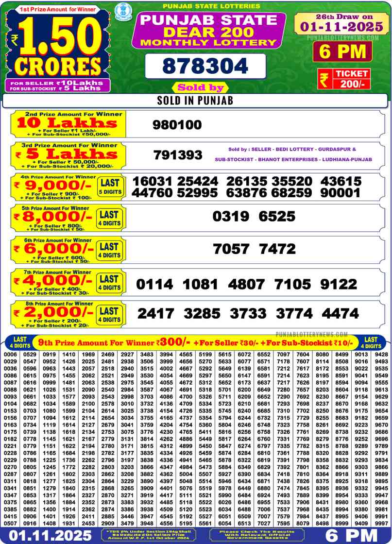 Punjab State Lottery 1.11.2025Today Result is Punjab State Dear 200 Monthly lottery Result draw whose Punjab lottery result is published a day. Mainly Punjab State Lottery is 8:00 pm Punjab State Lottery but being combined with lottery sambad, Punjab State Lottery will release the results of 08:00pm is published.
