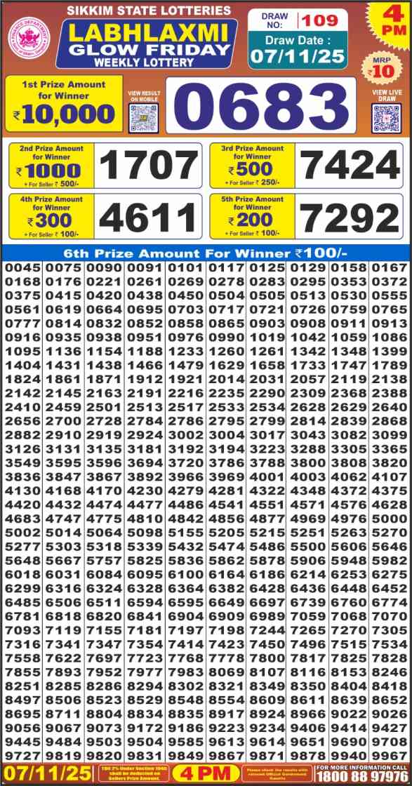 Sikkim State Lottery 7.11.2025 Today Result is Sikkim State Labh laxmi Glow Friday Weekly lottery Result draw whose Sikkim lottery result is published a day. Mainly Sikkim State Lottery is 4:00 pm Sikkim State Lottery but being combined with lottery sambad, Sikkim State Lottery will release the results of 04:00pm is published.