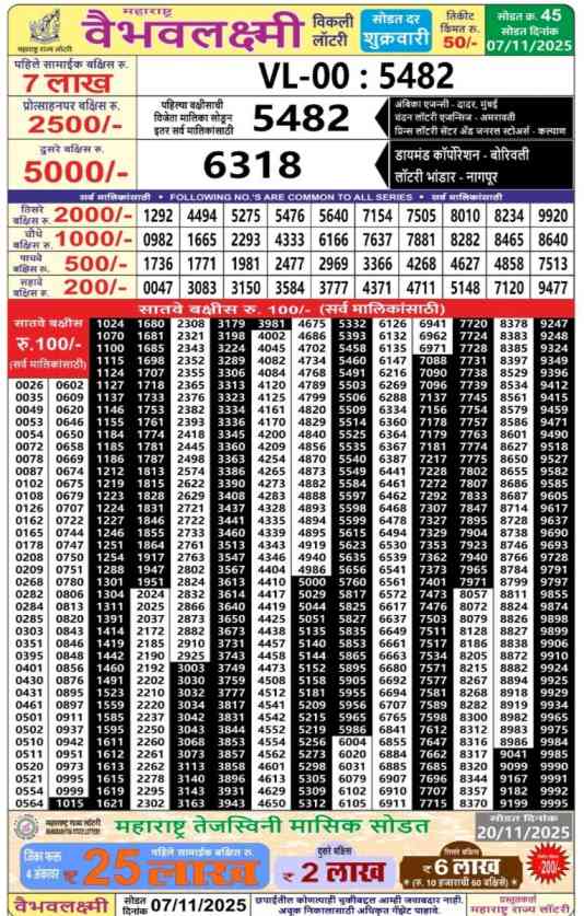 Maharashtra State Vaibhav Laxmi lottery ticket is only 50 rupees for 1 ticket, but 7 Lakh Rupees is given as prize for winning the major. Results are also placed on this page which you can see Maharashtra Vaibhav Laxmir Result Today 7.11.2025 is searched by different names, Maharashtra State Vaibhav Laxmi Weekly 2025, Maharashtra Vaibhav Laxmi Weekly Lottery Result 2025, Maharashtra Vaibhav Laxmi Lottery Result 7.11.2025 Live Result 4:15 PM, Maharashtra Vaibhav Laxmi Lottery Result 7.11.2025, Dear Maharashtra Vaibhav Laxmi  PDF Result, Today Live Maharashtra Vaibhav Laxmi Weekly Lottery Result, Maharashtra State Vaibhav Laxmi Weekly 2025 Draw, Maharashtra State Vaibhav Laxmi Weekly Lottery Result.