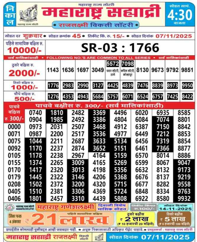 | Maharashtra State Sahyadri Rajlaxmi Weekly Lottery 7.11.2025 Result | Maharashtra State Lottery 4:30PM Result | Maharashtra State Sahyadri Rajlaxmi Weekly Lottery Result Today 4:30PM| Maharashtra State Lottery Result 4:30PM Today Live Draw | Maharashtra State Lottery | Check Maharashtra Sahyadri Rajlaxmi Weekly Weekly Lottery Result | |
