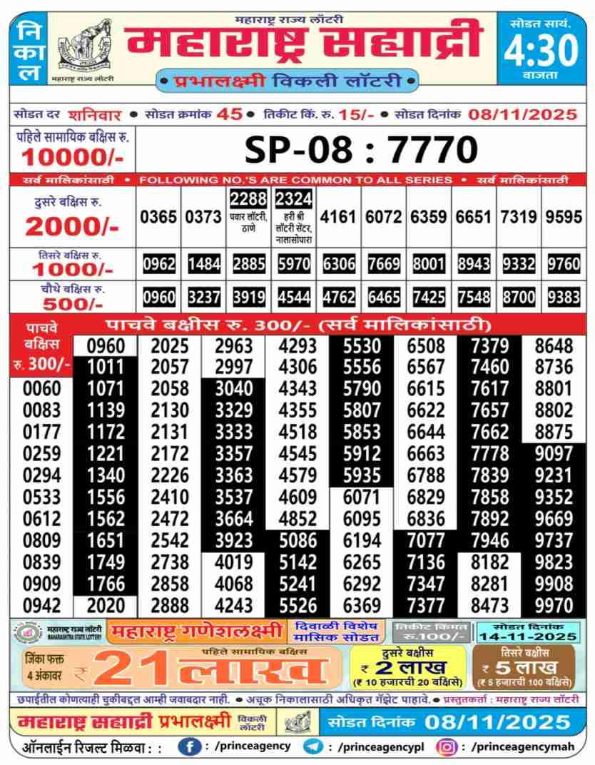 Maharashtra State Sahyadri Prabhalaxmi Lottery 4:30 pm Result 8.11.2025