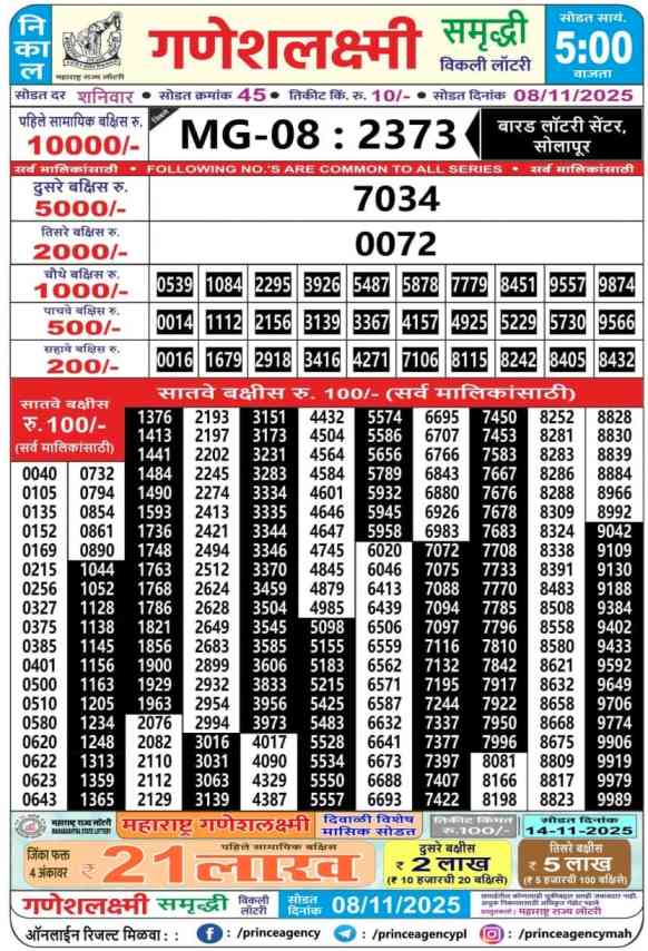 Maharashtra State Lottery declares many bumper results. Ganeshlaxmi Samriddhi Weekly Lottery Result 2025 is Maharashtra State Lottery at 5:00 PM whose result gets published on the page around 05:30 PM. Maharashtra State Lottery Result ,8.11.2025 Ganeshlaxmi Samriddhi Weekly Result, Ganeshlaxmi Samriddhi Result Today Live 05:00PM, Maharashtra Ganeshlaxmi Samriddhi Weekly Result 05:00PM, Maharashtra State Ganeshlaxmi Samriddhi Weekly Result, Maharashtra State lottery result 05:00PM, Ganeshlaxmi Samriddhi Weekly Result, Ganeshlaxmi Samriddhi Weekly result, Maharashtra Ganeshlaxmi Samriddhi Lottery Result Today 05:00PM, Ganeshlaxmi Samriddhi Lottery 05:00 PM result 8.11.2025, Maharashtra Ganeshlaxmi Samriddhi Weekly Lottery Result, Ganeshlaxmi Samriddhi Live Draw.