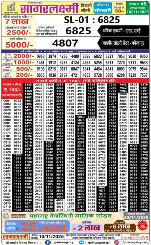 Download Maharashtra State Lottery 10.11.2025 Today 4:15pm Result from here. Maharashtra State Sagar Laxmi Weekly Lottery Result Important Lottery of Maharashtra State which is legally operated by the State Government there. You are satisfied to get the Result of Maharashtra Sagar Laxmi Lottery Draw at 04:15pm on this webpost Today’s lottery result of Maharashtra State Lottery 4:15pm is published here.