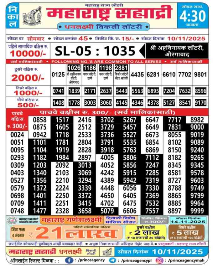 Maharashtra State Sahyadri Dhanlaxmi Weekly Lottery ticket is only Maharashtra Sahyadri Weekly rupees 15 for 1 ticket, but 10 thousand is given as prize for winning the major. Results are also placed on this page which you can see Sahyadri Dhanlaxmi Weekly Lottery Result today 10.11.2025 is searched by different names, Maharashtra State Sahyadri Dhanlaxmi Weekly Lottery Result 4:30PM, Maharashtra State lottery 4:30PM result , Maharashtra State Lottery today Sahyadri Dhanlaxmi Weekly lottery result, Maharashtra Sahyadri Dhanlaxmi Lottery Result, Maharashtra State Sahyadri Dhanlaxmi Weekly lottery result 2025, Sahyadri Dhanlaxmi Weekly lottery result 4:30PM, Maharashtra State lottery.