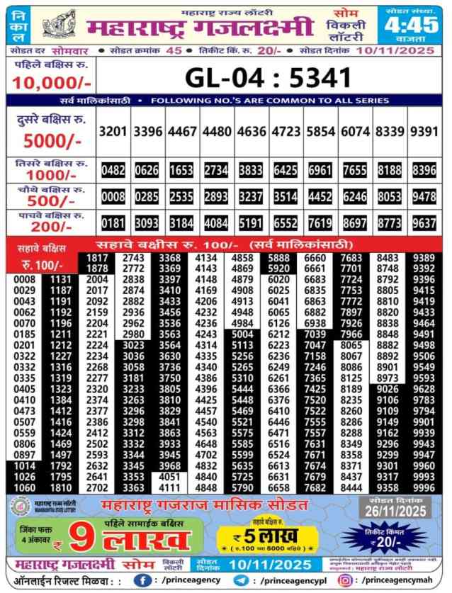 Maharashtra State Gajlaxmi Som Lottery 4:45 PM Result 10.11.2025