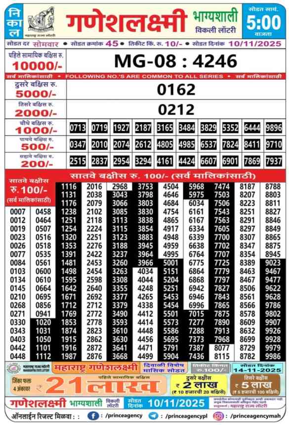 Maharashtra State Ganeshlaxmi Bhagyashali Weekly Lottery ticket is only Maharashtra Weekly rupees 10 for 1 ticket, but 10 thousand is given as prize for winning the major. Results are also placed on this page which you can see Ganeshlaxmi Bhagyashali Weekly Lottery Result today 10.11.2025 is searched by different names, Maharashtra State Ganeshlaxmi Bhagyashali Weekly Lottery Result 05:00pm, Maharashtra State lottery 05:00pm result , Maharashtra State Lottery today Ganeshlaxmi Bhagyashali Weekly lottery result, Maharashtra Ganeshlaxmi Bhagyashali Lottery Result, Maharashtra State Ganeshlaxmi Bhagyashali Weekly lottery result 2025, Ganeshlaxmi Bhagyashali Weekly lottery result 05:00pm, Maharashtra State lottery 2025.
