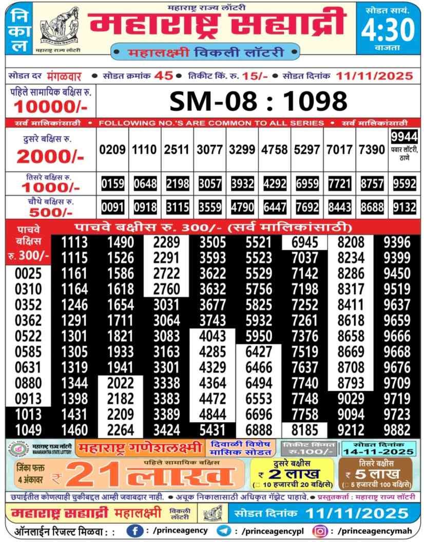 | Maharashtra Mahalaxmi Weekly Lottery Result Today Live 11.11.2025 | |