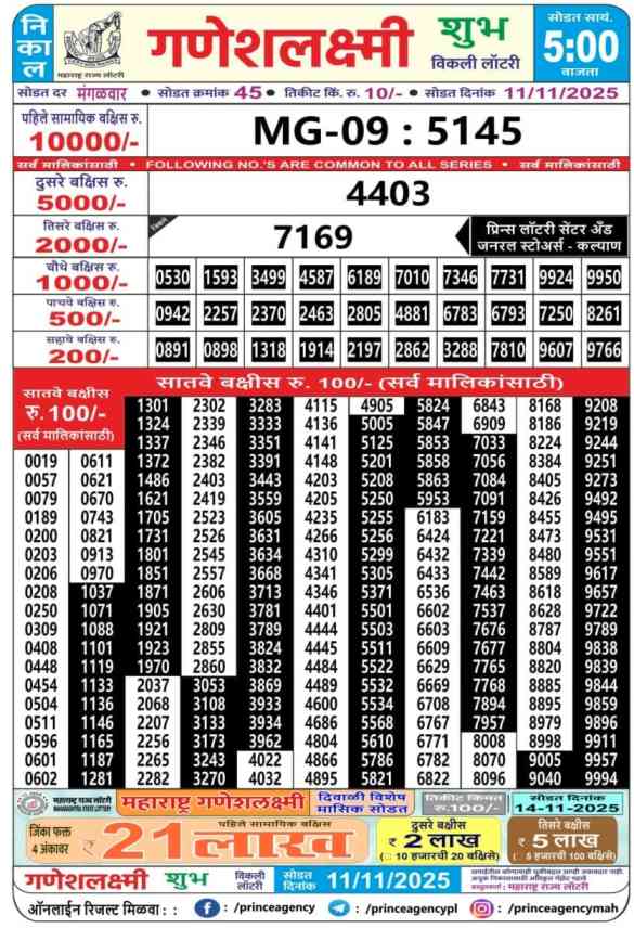| Maharashtra Ganeshlaxmi Shubh Weekly Lottery Result Today Live 11.11.2025 | |