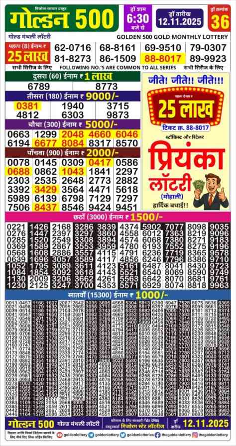 Mizoram State Golden 500 Gold Monthly Lottery Result 12.11.2025 Today Latest Update on 12 October 2025 : -Mizoram State Lottery’s Golden 500 Gold Monthly Lottery Results have been declared today on 12.11.2025 at 7:30PM for Mizoram State Golden 500 Gold Monthly Lottery Result Today Draw.