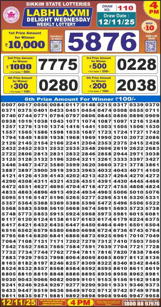 Sikkim State Lottery declares many bumper results. Labh laxmi Wednesday Weekly Lottery Result 2025 is Sikkim State Lottery at 04:00 PM whose result gets published on the page around 04:12 PM. Sikkim State Lottery Result ,12.11.2025 Labh laxmi Delight Result, Labh laxmi Wednesday Result Today Live 4PM, Sikkim Labh laxmi Weekly Result 4PM, Sikkim State Labh laxmi Delight Wednesday Result, Sikkim State lottery result 4PM, Labh laxmi Wednesday Weekly Result, Labh laxmi Delight 4 PM Result, Sikkim lottery result today 4PM, Labh laxmi Wednesday Lottery 4 PM result 12.11.2025, Sikkim Labh laxmi Wednesday Weekly Lottery Result, Sikkim Labh laxmi Wednesday Live Draw.
