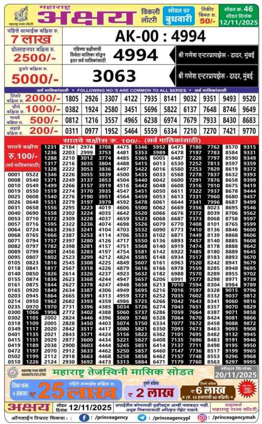 Download Maharashtra State Lottery 12.11.2025 Today 4:15pm Result from here. Maharashtra State Akshay Weekly Lottery Result Important Lottery of Maharashtra State which is legally operated by the State Government there. You are satisfied to get the Result of Maharashtra Akshay Lottery Draw at 04:15pm on this webpost Today’s lottery result of Maharashtra State Lottery 4:15pm is published here.