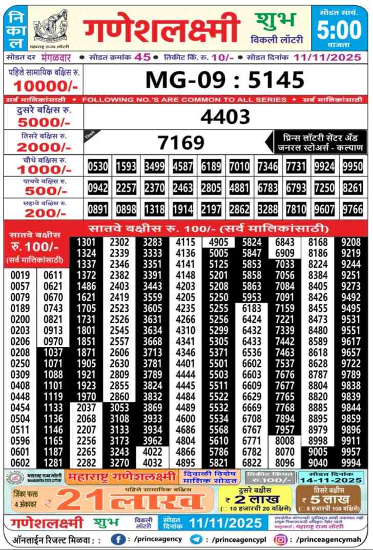 Maharashtra State Ganeshlaxmi Vijayi Weekly Lottery ticket is only Maharashtra Weekly rupees 10 for 1 ticket, but 10 thousand is given as prize for winning the major. Results are also placed on this page which you can see Ganeshlaxmi Vijayi Weekly Lottery Result today 12.11.2025 is searched by different names, Maharashtra State Ganeshlaxmi Vijayi Weekly Lottery Result 05:00pm, Maharashtra State lottery 05:00pm result , Maharashtra State Lottery today Ganeshlaxmi Vijayi Weekly lottery result, Maharashtra Ganeshlaxmi Vijayi Lottery Result, Maharashtra State Ganeshlaxmi Vijayi Weekly lottery result 2025, Ganeshlaxmi Vijayi Weekly lottery result 05:00pm, Maharashtra State lottery 2025.