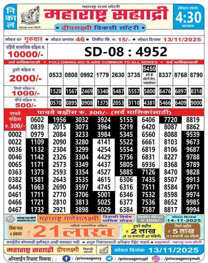 | Maharashtra State Sahyadri Deeplaxmi Weekly Lottery 13.11.2025 Result | Maharashtra State Lottery 4:30pm Result | Maharashtra State Sahyadri Deeplaxmi Weekly Lottery Result Today 04:30pm| Maharashtra State Lottery Result 04:30pm Today Live Draw | Maharashtra State Lottery | Check Maharashtra Sahyadri Deeplaxmi Weekly Weekly Lottery Result | |