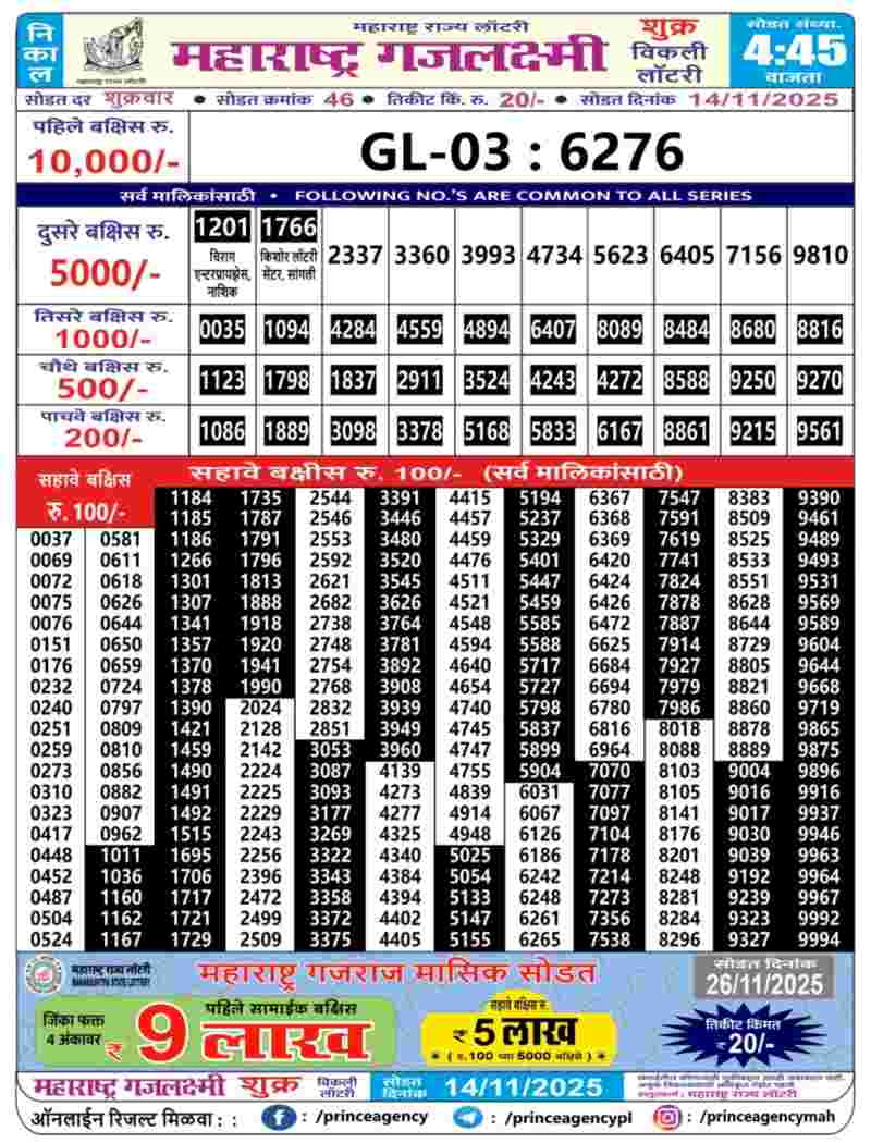 Maharashtra State Lottery 14.11.2025 Today Result is Maharashtra State Gajlaxmi Shukra Weekly Weekly lottery Result draw whose Maharashtra lottery result is published a day. Mainly Maharashtra State Lottery is 4:45 pm Maharashtra State Lottery but being combined with lottery sambad, Maharashtra State Lottery will release the results of 04:45pm is published.
