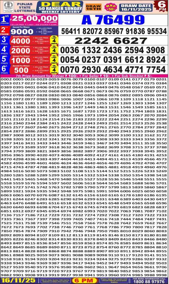 Punjab State Lottery declares many bumper results. Dear Sunday Weekly Lottery Result 2025 is Punjab State Lottery at 06:00 PM whose result gets published on the page around 06:30 PM. Punjab State Lottery Result, 16.11.2025 Dear 50 Ranger Result, Dear Sunday Result Today Live 6PM, Punjab Dear Weekly Result 6PM, Punjab State Dear 50 Ranger Sunday Result, Punjab State lottery result 6PM, Dear Sunday Weekly Result, Punjab Dear 50 Ranger Sunday result, punjab Dear 50 Ranger Result, Punjab lottery result today 6PM, punjab Dear Sunday Lottery result 16.11.2025, Punjab Dear Ranger Sunday Weekly Lottery Result.