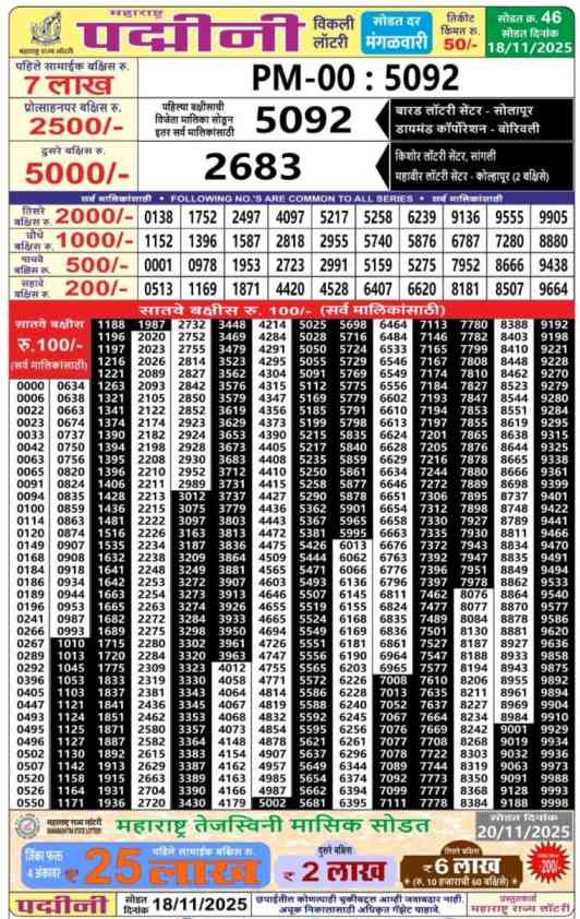 Download Maharashtra State Lottery 18.11.2025 Today 4:15pm Result from here. Maharashtra State Padmini Weekly Lottery Result Important Lottery of Maharashtra State which is legally operated by the State Government there. You are satisfied to get the Result of Maharashtra Padmini Lottery Draw at 04:15pm on this webpost Today’s lottery result of Maharashtra State Lottery 4:15pm is published here.