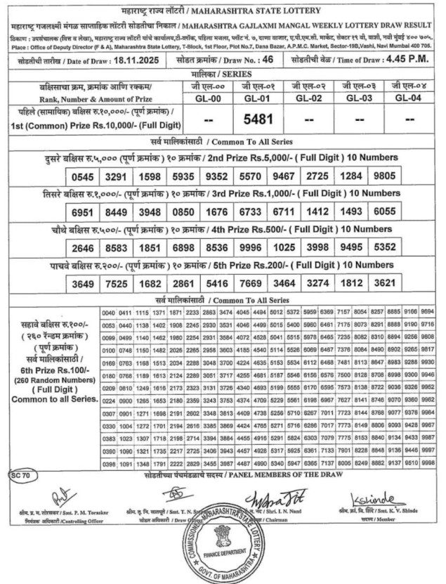 | Maharashtra Gajlaxmi Mangal Weekly Lottery Result Today Live 18.11.2025 | |