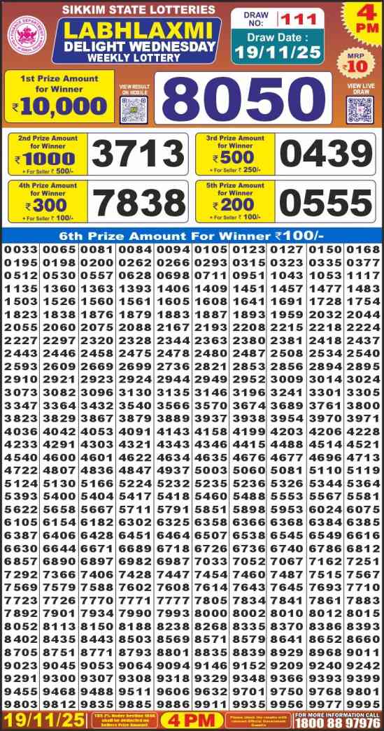 Sikkim State Lottery 19.11.2025 Today Result is Sikkim State Labh laxmi Delight Wednesday Weekly lottery Result draw whose Sikkim lottery result is published a day. Mainly Sikkim State Lottery is 4:00 pm Sikkim State Lottery but being combined with lottery sambad, Sikkim State Lottery will release the results of 04:00pm is published.