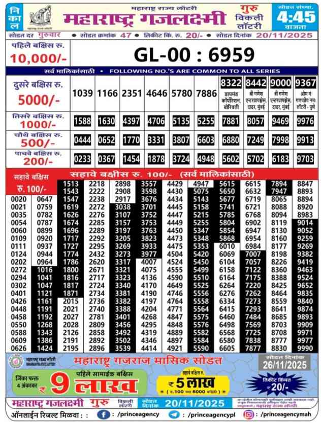 Maharashtra State Lottery declares many bumper results. Gajlaxmi Guru Weekly Lottery Result 2025 is Maharashtra State Lottery at 04:45 PM whose result gets published on the page around 05:30 PM. Maharashtra State Lottery Result ,20.11.2025 Gajlaxmi Guru Weekly Result, Gajlaxmi Guru Result Today Live 4:45PM, Maharashtra Gajlaxmi Guru Weekly Result 4:45PM, Maharashtra State Gajlaxmi Guru Weekly Result, Maharashtra State lottery result 4:45PM, Gajlaxmi Guru Weekly Result, Gajlaxmi Guru Weekly result, Maharashtra lottery result today 4:45PM, Gajlaxmi Guru Lottery 4:45 PM result 20.11.2025, Maharashtra Gajlaxmi Guru Weekly Lottery Result, Gajlaxmi Guru Live Draw.