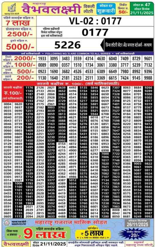 MAHARASHTRA VAIBHAV LAXMI LOTTERY 2025 DRAW DATE- 21.11.2025