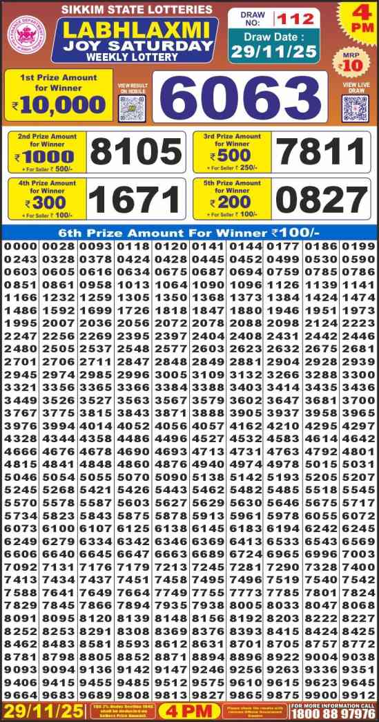 Sikkim State Lottery declares many bumper results. Labh laxmi Saturday Weekly Lottery Result 2025 is Sikkim State Lottery at 04:00 PM whose result gets published on the page around 04:12 PM. Sikkim State Lottery Result ,29.11.2025 Labh laxmi Joy Result, Labh laxmi Saturday Result Today Live 4PM, Sikkim Labh laxmi Weekly Result 4PM, Sikkim State Labh laxmi Joy Saturday Result, Sikkim State lottery result 4PM, Labh laxmi Saturday Weekly Result, Labh laxmi Joy result, 4 PM Result, Sikkim lottery result today 4PM, Labh laxmi Saturday Lottery 4 PM result 29.11.2025, Sikkim Labh laxmi Saturday Weekly Lottery Result, Labh laxmi Saturday Live Draw.