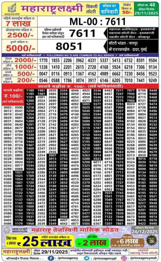 Maharashtra Laxmi WeeklyLottery Announced on 29.11.2025. Winner list Announcement by Maharashtra State Lotteries Board.