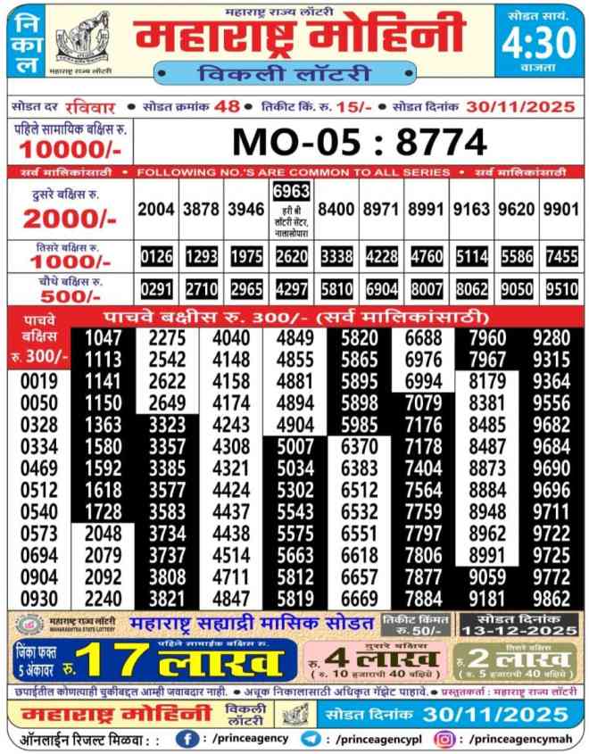 | Maharashtra State 30.11.2025 Mohini Weekly Lottery Result 04:15 PM | Maharashtra State Mohini Weekly 2025 | Maharashtra State Mohini Weekly Lottery Draw Result | Maharashtra Mohini Lottery Result 04:15PM| Maharashtra State Lottery| Check Maharashtra State Lottery | |