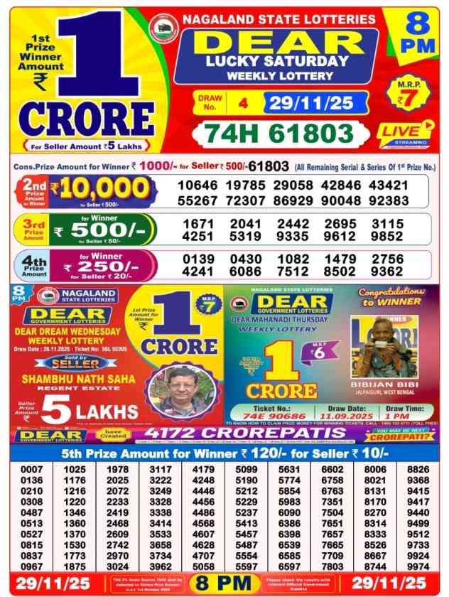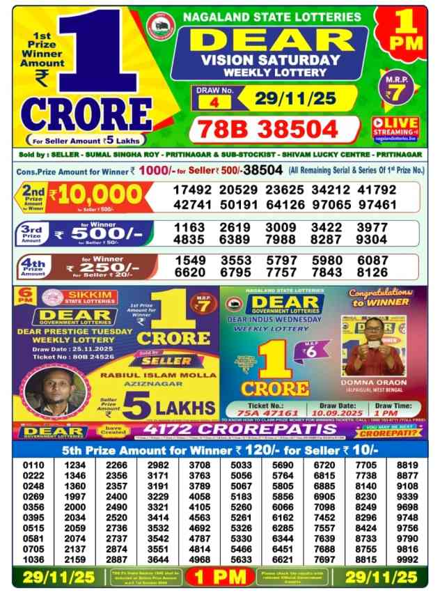 As per the official information provided by the Nagaland State Lotteries, 2.12.2025 Results the winner of today’s Dear First Winner award will receive INR 1 Crore from a ticket worth INR 6. You can check your result from the lotterysambad 2 12 25 link given below…