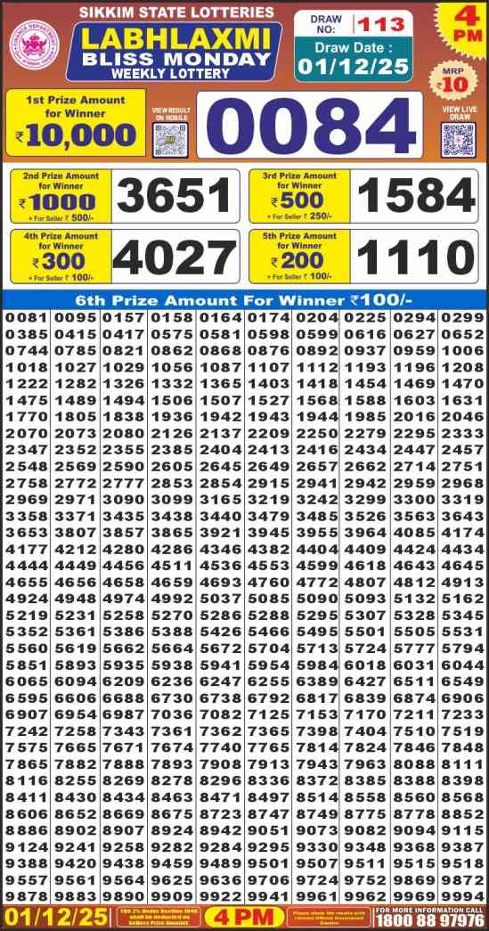 Sikkim State Lottery declares many bumper results. Labh laxmi Monday Weekly Lottery Result 2025 is Sikkim State Lottery at 04:00 PM whose result gets published on the page around 04:12 PM. Sikkim State Lottery Result ,1.12.2025 Labh laxmi Bliss Result, Labh laxmi Monday Result Today Live 4PM, Sikkim Labh laxmi Weekly Result 4PM, Sikkim State Labh laxmi Bliss Monday Result, Sikkim State lottery result 4PM, Labh laxmi Monday Weekly Result, Labh laxmi Bliss result 4 PM, Sikkim lottery result today 4PM, Labh laxmi Monday Lottery 4 PM result 1.12.2025, Sikkim Labh laxmi Monday Weekly Lottery Result, Labh laxmi Monday Live Draw.