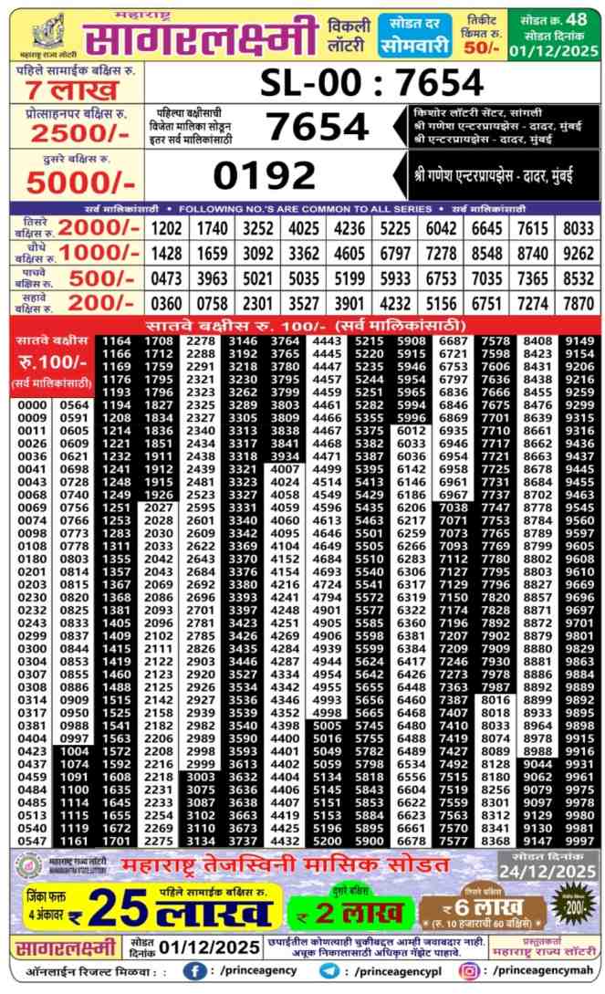 Download Maharashtra State Lottery 1.12.2025 Today 4:15pm Result from here. Maharashtra State Sagar Laxmi Weekly Lottery Result Important Lottery of Maharashtra State which is legally operated by the State Government there. You are satisfied to get the Result of Maharashtra Sagar Laxmi Lottery Draw at 04:15pm on this webpost Today’s lottery result of Maharashtra State Lottery 4:15pm is published here.