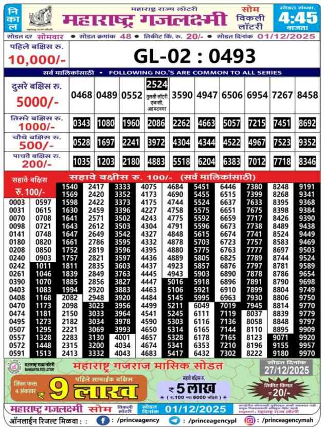 | Maharashtra Gajlaxmi Som Weekly Lottery Result Today Live 1.12.2025 | |