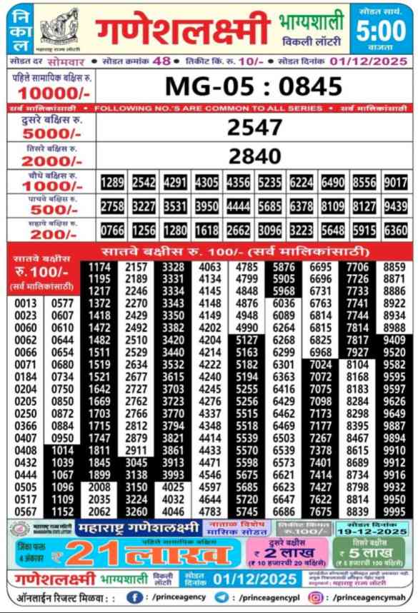 Maharashtra State Ganeshlaxmi Bhagyashali Lottery 05:00 PM Result 1.12.2025