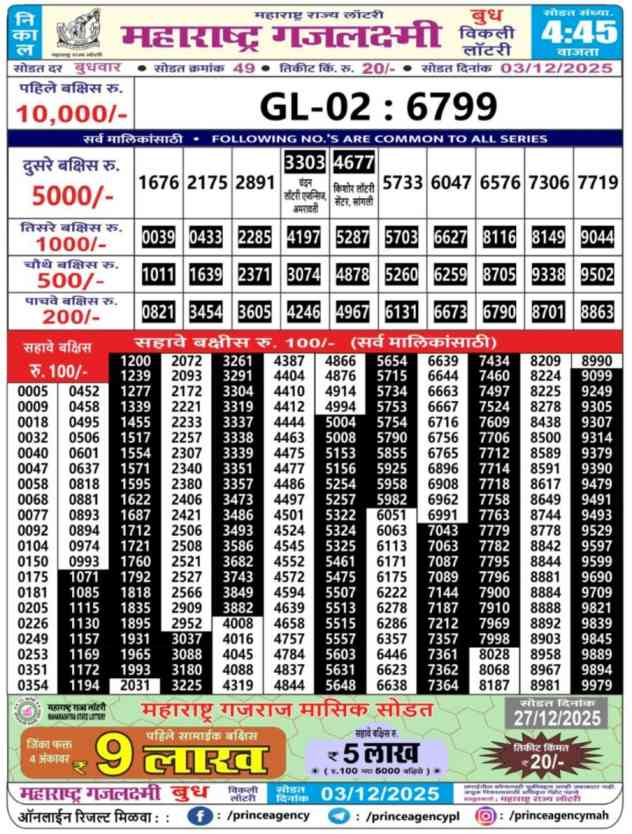 If you are interested to know Punjab lottery sambad today Gajlaxmi Mangal Weekly result then here at 4:45 pm Maharashtra State lottery result is declared which you can see here in jpg format. Stay on this page till 04:45 PM To 05:00 PM for Maharashtra State lottery Gajlaxmi Weekly live draw.