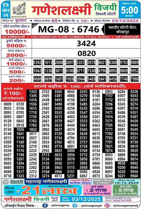 Maharashtra State Ganeshlaxmi Vijayi Weekly Lottery ticket is only Maharashtra Weekly rupees 10 for 1 ticket, but 10 thousand is given as prize for winning the major. Results are also placed on this page which you can see Ganeshlaxmi Vijayi Weekly Lottery Result today 3.12.2025 is searched by different names, Maharashtra State Ganeshlaxmi Vijayi Weekly Lottery Result 05:00pm, Maharashtra State lottery 05:00pm result , Maharashtra State Lottery today Ganeshlaxmi Vijayi Weekly lottery result, Maharashtra Ganeshlaxmi Vijayi Lottery Result, Maharashtra State Ganeshlaxmi Vijayi Weekly lottery result 2025, Ganeshlaxmi Vijayi Weekly lottery result 05:00pm, Maharashtra State lottery 2025.
