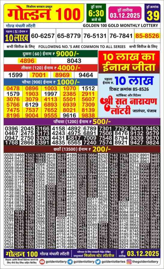 Mizoram State Golden 100 Gold Monthly Lottery Result 3.12.2025 Today Latest Update on 03 December 2025 : -Mizoram State Lottery’s Golden 100 Gold Monthly Lottery Results have been declared today on 3.12.2025 at 7:30PM for Mizoram State Golden 100 Gold Monthly Lottery Result Today Draw.