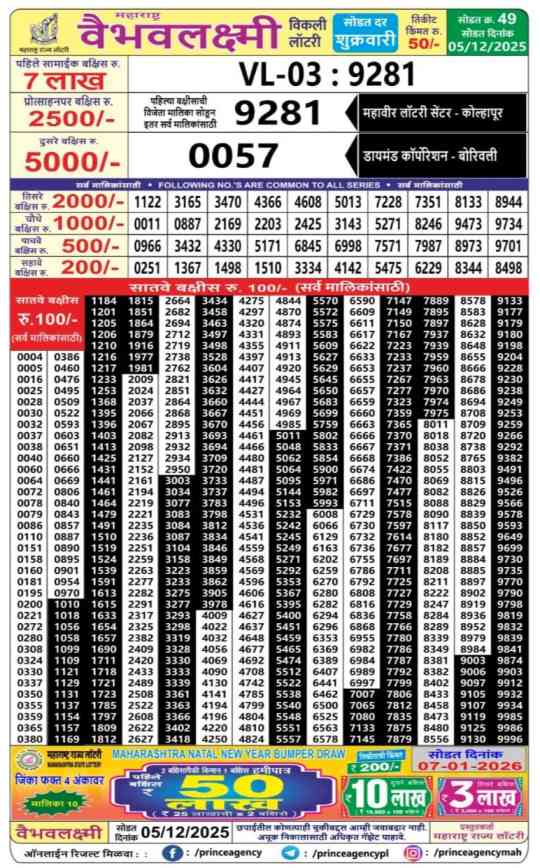 Maharashtra State Vaibhav Laxmi lottery ticket is only 50 rupees for 1 ticket, but 7 Lakh Rupees is given as prize for winning the major. Results are also placed on this page which you can see Maharashtra Vaibhav Laxmir Result Today 5.12.2025 is searched by different names, Maharashtra State Vaibhav Laxmi Weekly 2025, Maharashtra Vaibhav Laxmi Weekly Lottery Result 2025, Maharashtra Vaibhav Laxmi Lottery Result 5.12.2025 Live Result 4:15 PM, Maharashtra Vaibhav Laxmi Lottery Result 5.12.2025, Dear Maharashtra Vaibhav Laxmi PDF Result, Today Live Maharashtra Vaibhav Laxmi Weekly Lottery Result, Maharashtra State Vaibhav Laxmi Weekly 2025 Draw, Maharashtra State Vaibhav Laxmi Weekly Lottery Result.