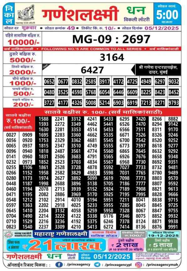 | Maharashtra Ganeshlaxmi Dhan Weekly Lottery Result Today Live 5.12.2025 | |