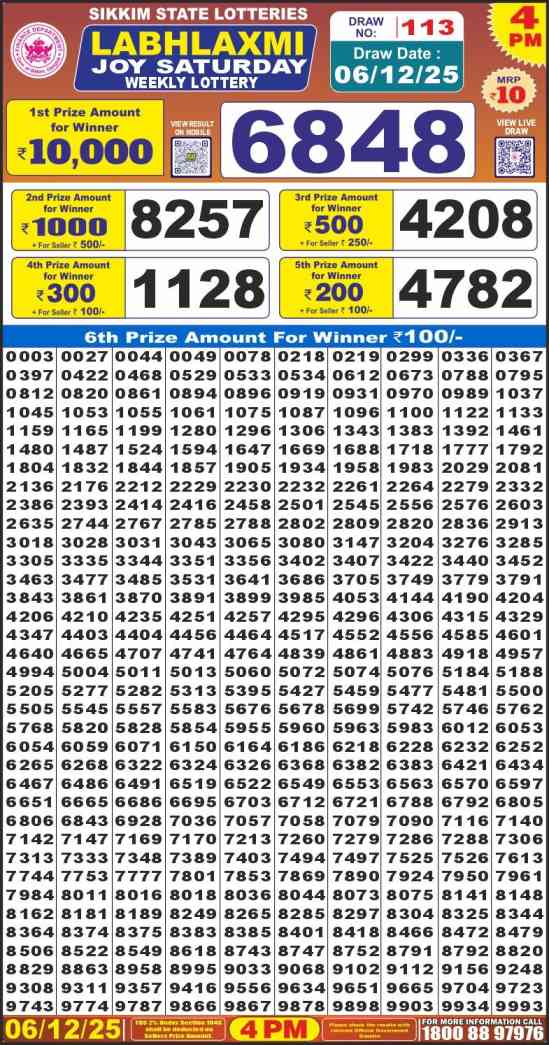 | Sikkim Labh laxmi Joy Saturday Lottery Result Today Live 6.12.2025 | |