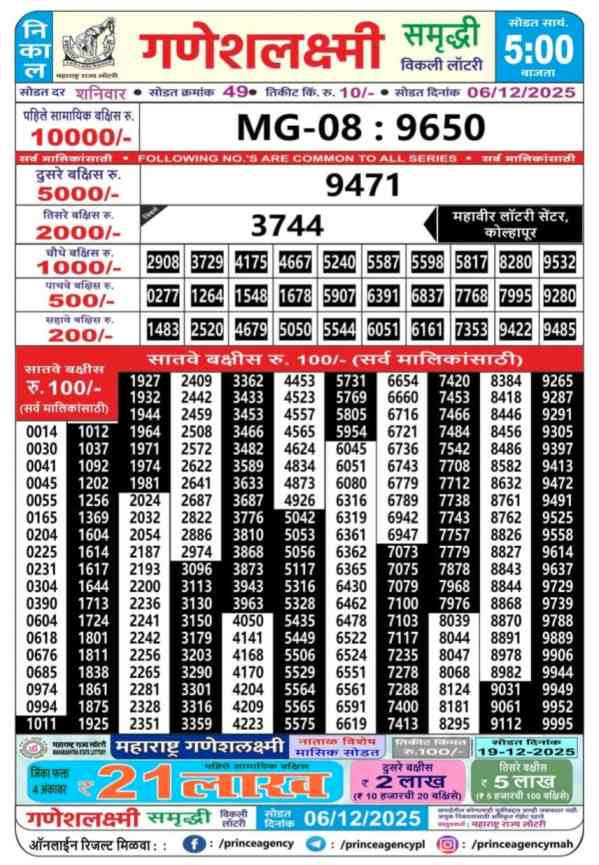 Maharashtra State Lottery 6.12.2025 Today Result is Maharashtra State Ganeshlaxmi Samriddhi Weekly Weekly lottery Result draw whose Maharashtra lottery result is published a day. Mainly Maharashtra State Lottery is 05:00 pm Maharashtra State Lottery but being combined with lottery sambad, Maharashtra State Lottery will release the results of 5:00pm is published.