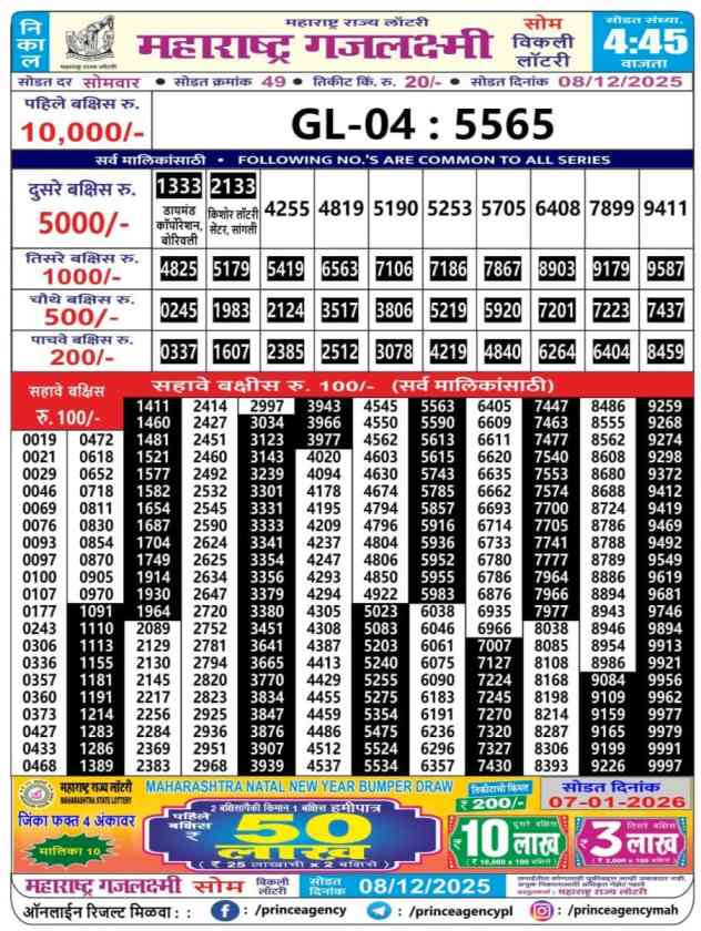 Maharashtra State Lottery declares many bumper results. Gajlaxmi Som Weekly Lottery Result 2025 is Maharashtra State Lottery at 04:45 PM whose result gets published on the page around 05:30 PM. Maharashtra State Lottery Result ,8.12.2025 Gajlaxmi Som Weekly Result, Gajlaxmi Som Result Today Live 4:45PM, Maharashtra Gajlaxmi Som Weekly Result 4:45PM, Maharashtra State Gajlaxmi Som Weekly Result, Maharashtra State lottery result 4:45PM, Gajlaxmi Som Weekly Result, Gajlaxmi Som Weekly result, Maharashtra lottery result today 4:45PM, Gajlaxmi Som Lottery 4:45 PM result 8.12.2025, Maharashtra Gajlaxmi Som Weekly Lottery Result, Gajlaxmi Som Live Draw.