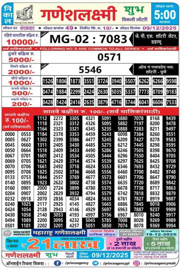 Maharashtra State Lottery declares many bumper results. Ganeshlaxmi Shubh Weekly Lottery Result 2025 is Maharashtra State Lottery at 5:00 PM whose result gets published on the page around 05:30 PM. Maharashtra State Lottery Result ,9.12.2025 Ganeshlaxmi Shubh Weekly Result, Ganeshlaxmi Shubh Result Today Live 05:00PM, Maharashtra Ganeshlaxmi Shubh Weekly Result 05:00PM, Maharashtra State Ganeshlaxmi Shubh Weekly Result, Maharashtra State lottery result 05:00PM, Ganeshlaxmi Shubh Weekly Result, Ganeshlaxmi Shubh Weekly result, Maharashtra Ganeshlaxmi Shubh Lottery Result Today 05:00PM, Ganeshlaxmi Shubh Lottery 05:00 PM result 9.12.2025, Maharashtra Ganeshlaxmi Shubh Weekly Lottery Result, Maharashtra Ganeshlaxmi Shubh Live Draw.