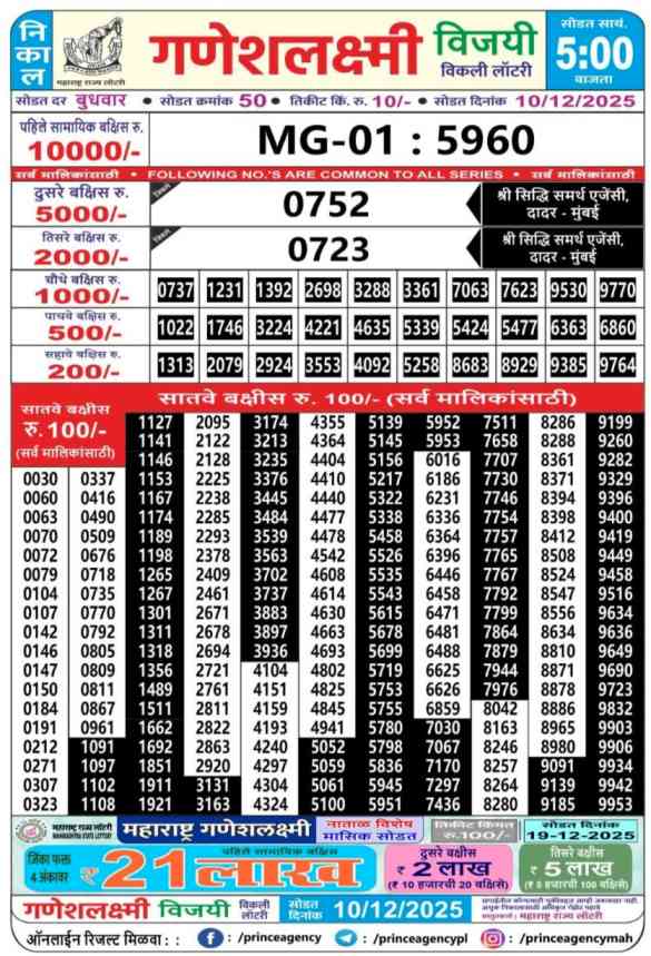 Maharashtra State Ganeshlaxmi Vijayi Weekly Lottery ticket is only Maharashtra Weekly rupees 10 for 1 ticket, but 10 thousand is given as prize for winning the major. Results are also placed on this page which you can see Ganeshlaxmi Vijayi Weekly Lottery Result today 10.12.2025 is searched by different names, Maharashtra State Ganeshlaxmi Vijayi Weekly Lottery Result 05:00pm, Maharashtra State lottery 05:00pm result , Maharashtra State Lottery today Ganeshlaxmi Vijayi Weekly lottery result, Maharashtra Ganeshlaxmi Vijayi Lottery Result, Maharashtra State Ganeshlaxmi Vijayi Weekly lottery result 2025, Ganeshlaxmi Vijayi Weekly lottery result 05:00pm, Maharashtra State lottery 2025.