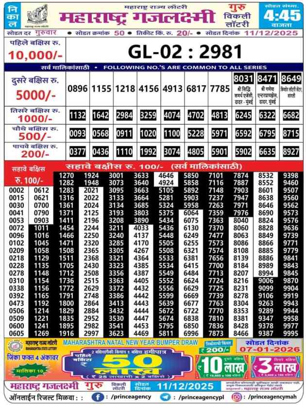 Maharashtra State Gajlaxmi Guru Weekly Lottery ticket is only Guru Weekly rupees for 1 ticket, but 1 Lakh is given as prize for winning the major. Results are also placed on this page which you can see Gajlaxmi Guru Weekly Lottery Result today 11.12.2025 is searched by different names, Maharashtra State Gajlaxmi Guru Weekly Lottery Result 4:45pm, Maharashtra State lottery 4:45pm result , Maharashtra State Lottery today Gajlaxmi Guru Weekly lottery result, Maharashtra Gajlaxmi Guru Lottery Result, Maharashtra State Gajlaxmi Guru Weekly lottery result 2025, Gajlaxmi Guru Weekly lottery result 4:45pm, Maharashtra State lottery 2025.