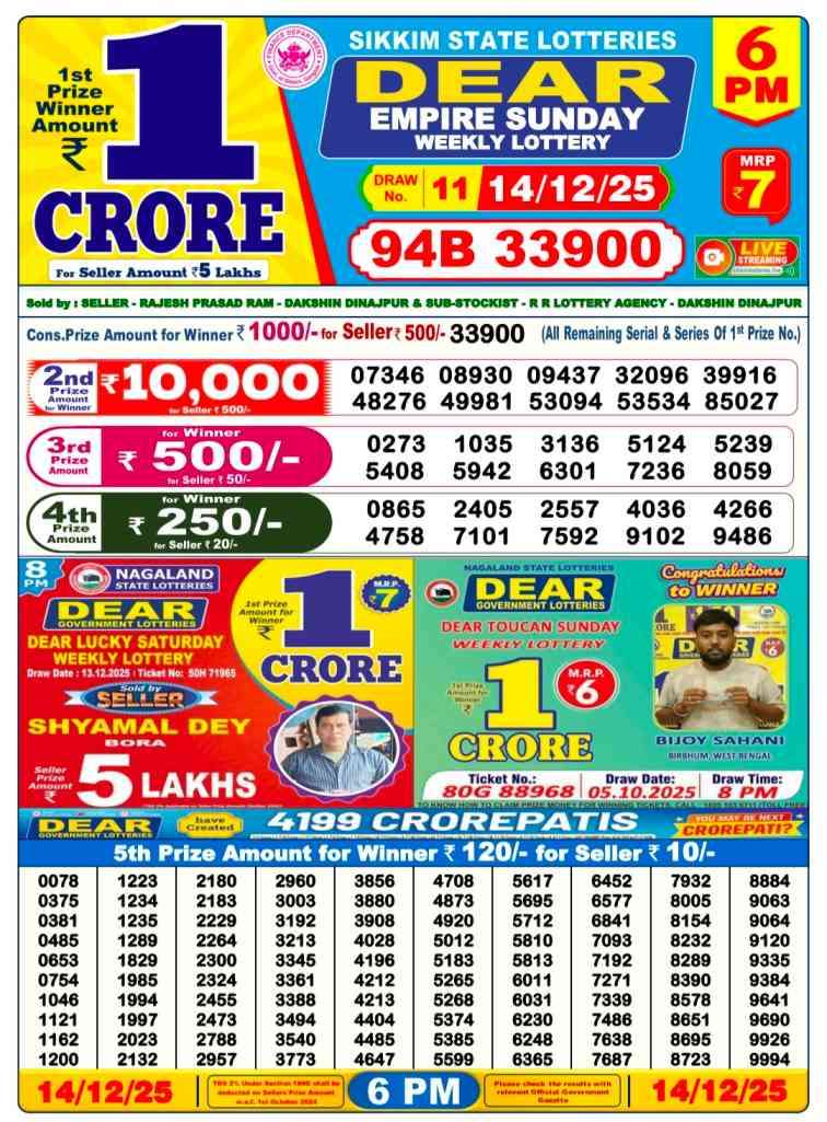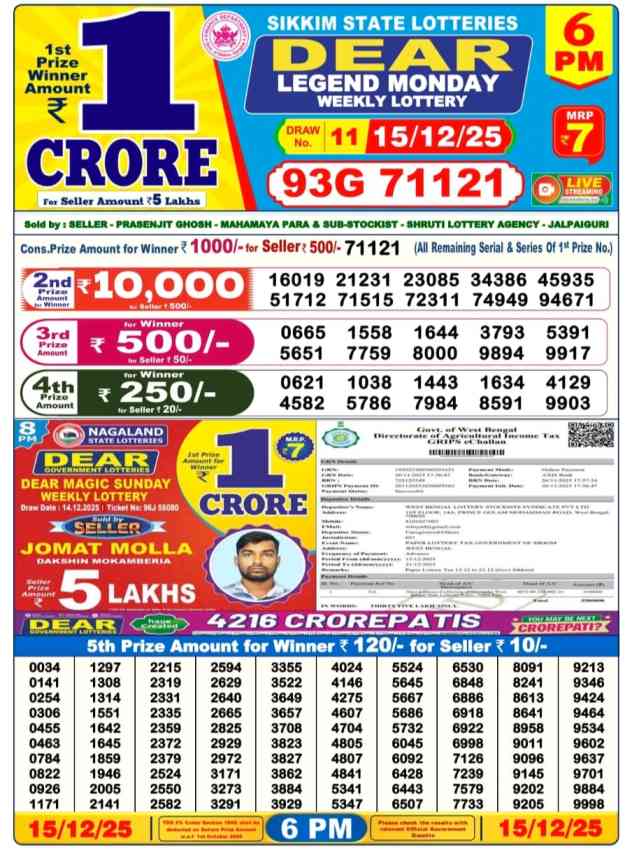 | Nagaland StateĀ Lottery Sambad 15.12.2025 Result | Lottery Sambad Today Night Result| Lottery Sambad Today 8pm Result| Sikkim State Lottery 1pm 6pm 8pm Result| Nagaland State Lottery| Check Lottery Result | |