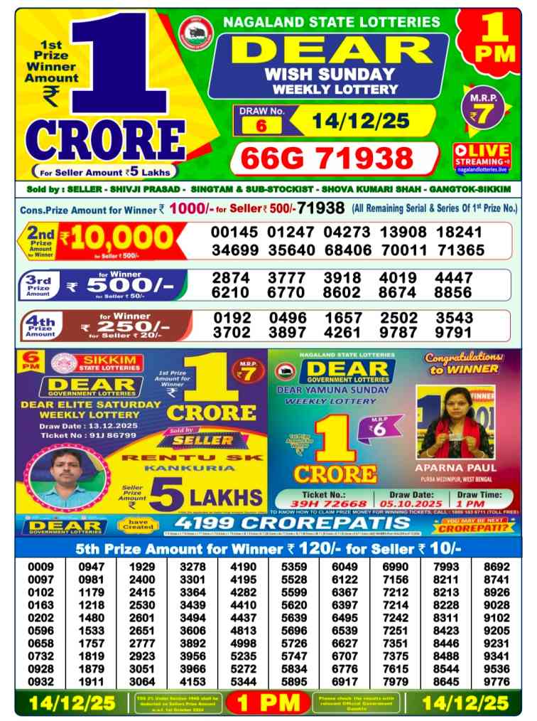 Nagaland State Lottery declares three results in a day. The first of which is Nagaland State Lottery at 1pm, whose result is published on the page at around 1:12pm. Dear Nagaland Lottery Sambad Result 15.12.2025 at 1pm, 6pm, 8pm many participants see the lottery result. lottery sambad morning ,sikkim state lottery result 1pm, dhankesari lottery sambad result 1pm due to all being combined a lot of people come to lottery sambad result at 1pm and your search ends here because Here the lottery result of lottery sambad is published first.