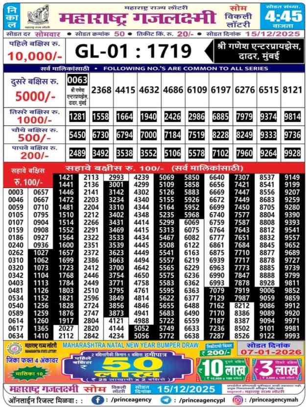 Maharashtra State Gajlaxmi Som Weekly Lottery 15.12.2025 Result |  Maharashtra State Lottery 8PM Result | Maharashtra State Gajlaxmi Som Weekly Lottery Result Today 4:45PM| Maharashtra State Lottery Result 4:45PM Today Live Draw | Maharashtra State Lottery | Check Maharashtra Gajlaxmi Som Weekly Weekly Lottery Result